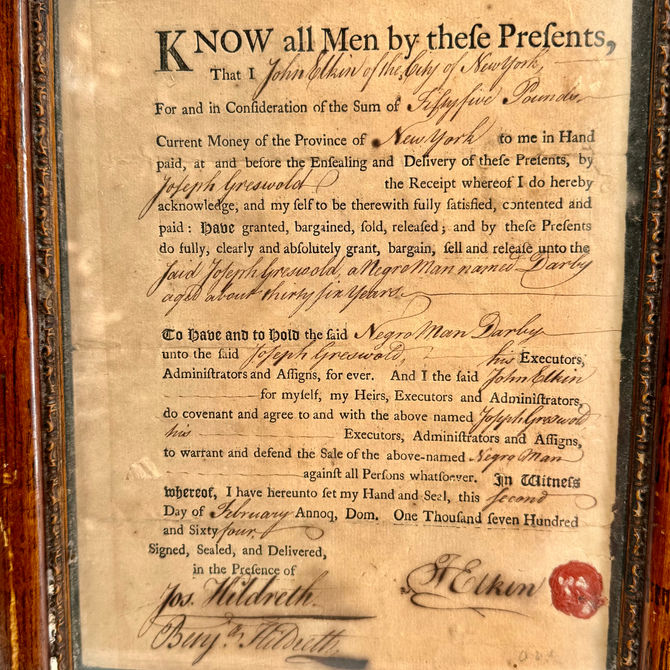 Printed and signed 18th-century slave contract dated February 2, 1764. Sale for a negro man named Darby, 36 years old, for the sum of fifty-five pounds. Fifty-five pounds in 1764 were worth approximately $13,146.00 today.