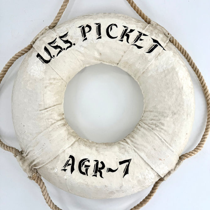 This small-sized life-ring most likely came from a vessel that assisted the larger 441-foot ship. A picket boat is a type of small naval craft primarily used by larger warships as a ship's boat. They are usually 30 to 55 feet long and would, I surmise, carry a smaller-sized life ring. Made from painted canvas-covered kapok, measuring 15 inches in diameter.